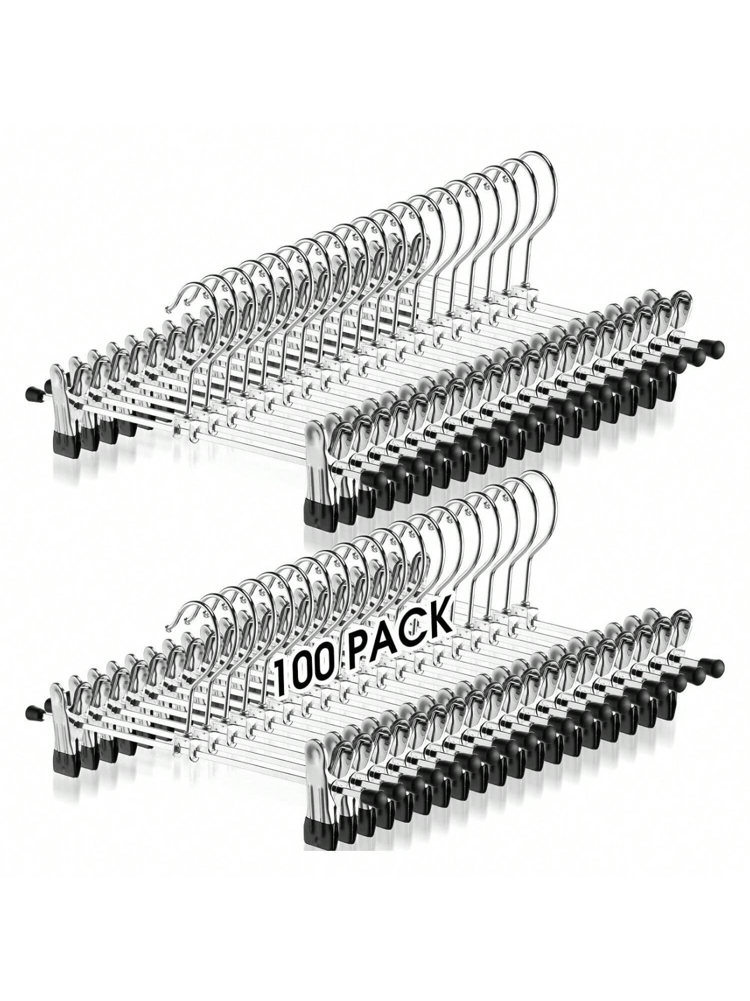 100 Packs Pant Hangers with Clips are the ultimate solution for organizing your wardrobe. These adjustable metal hangers are designed to keep your pants and skirts neatly hung, saving you valuable closet space. With their sleek silver and black finish, they add a touch of elegance to any closet. Crafted from heavy-duty metal, these ultra-thin hangers are built to last. The sturdy clips securely hold your garments in place, preventing them from slipping or creasing. Whether you're hanging jeans, trousers, or skirts, these hangers provide reliable support. The pack includes 100 hangers, ensuring that you have more than enough to organize your entire wardrobe. Their compact design allows for efficient storage and easy access to your clothes. No more rummaging through a messy closet! These pant hangers are not only practical but also versatile. They come in a variety of colors, allowing you to color-coordinate your clothing collection effortlessly. From vibrant multicolor options to classic silver and black choices, there's a style for everyone. Upgrade your closet organization with these space-saving pant hangers. Say goodbye to cluttered closets and hello to a well-organized wardrobe!