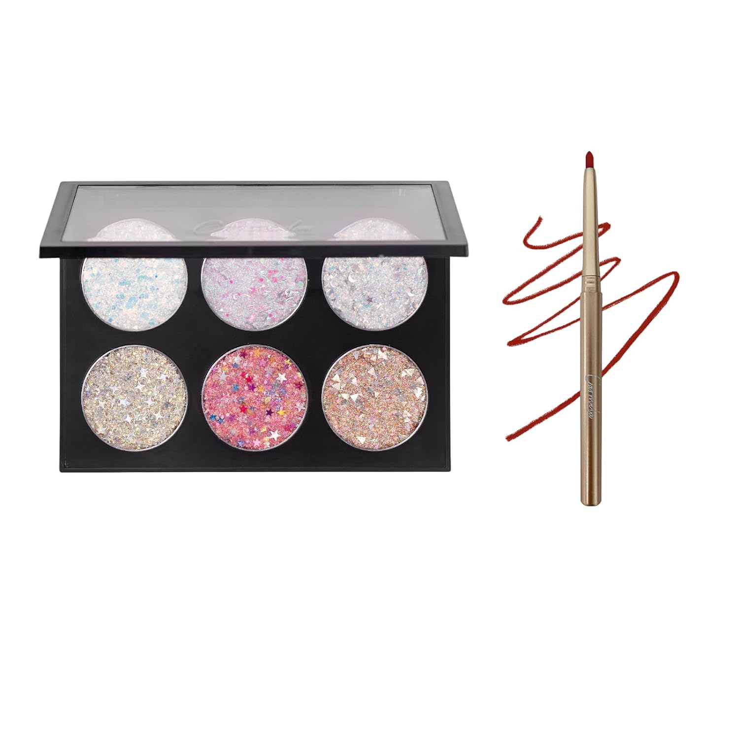 CAR MELA Glitter Eyeshadow Palette and Red Eyeliner Set, Non-sticky Chunky Glitter Pallet and Intense Red Eyeliner