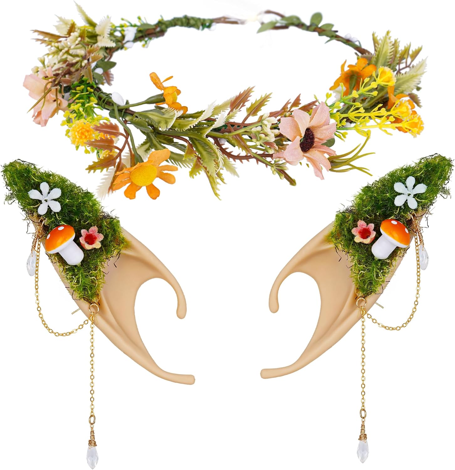 FRESHME Fairy Mushroom Elf Ears with Butterfly Flower Headpiece Set, Forest Mushroom Pixie Ears and Elf Floral Woodland Crown for Women Girls Renaissance Wedding Halloween Cosplay Bridal Photo Shoot