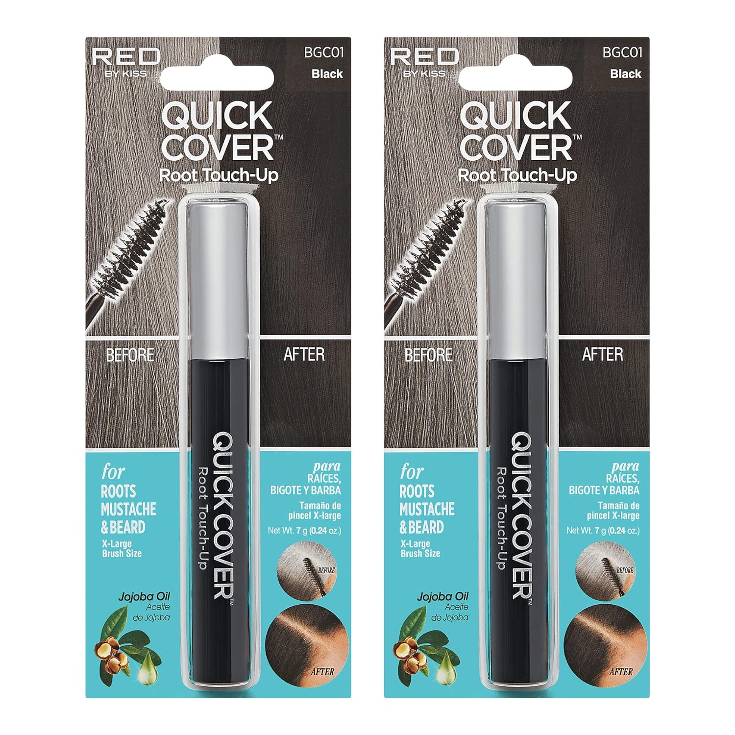 RED by Kiss Quick Cover Root Touch Up Rescue, Mascara Natural Water-Resistant Temporary Gray Concealer Cover Up Brush for Hair Mustache & Beard (Black) (2Pcs)