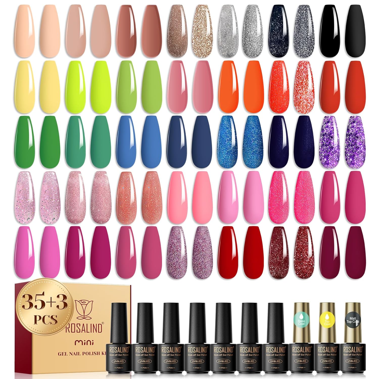 ROSALIND 38PCS Gel Nail Polish Set All Seasons Red Pink Nude Blue Green Gel Polish Set No Wipe Soak Off Base and Glossy & Matte Gel Top Coat Nail Gel Set Suitable For Manicure Gift Choice