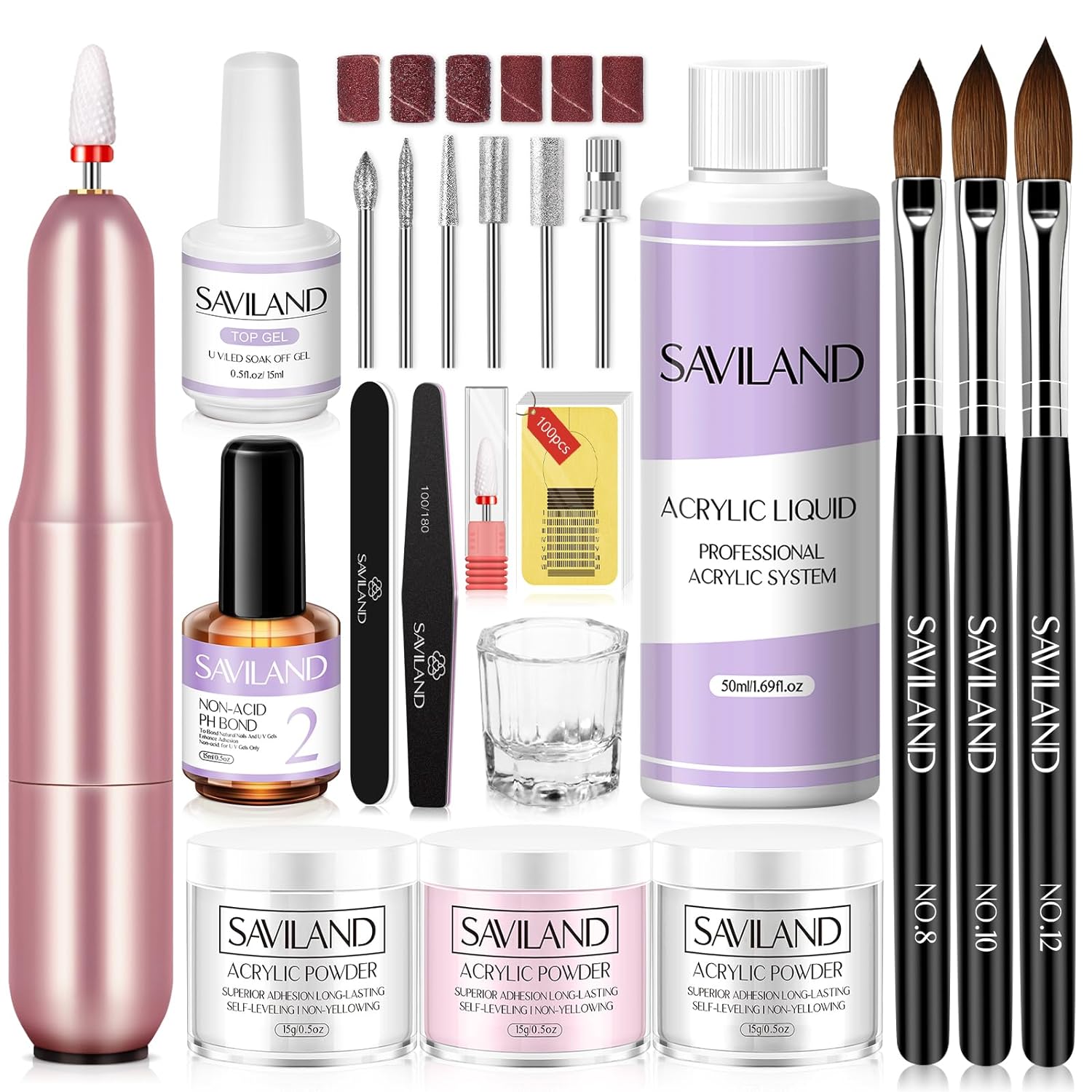 Saviland Acrylic Nail Kit with Drill, 15g Clear/White/Pink Acrylic Powder and Liquid Set with Nail Drill Acrylic Nail Brush Nail Forms Dappen Dish, Easy to Use Acrylic Nail Supplies for Beginners